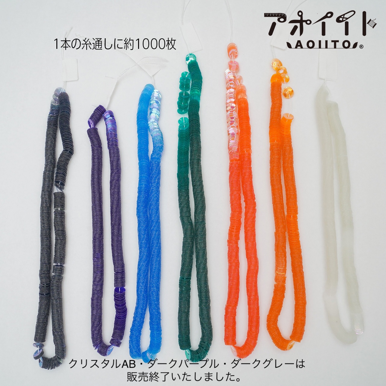 ・サイズ:約5mm ・仕入元:フランス ・組成:アセチルセルロース ・カラー:ライトサーモン(オレンジ寄りのピンク)/ タンジェリンオレンジ(オレンジ)/ ブルー(青色)/ ダークグリーン(緑色)